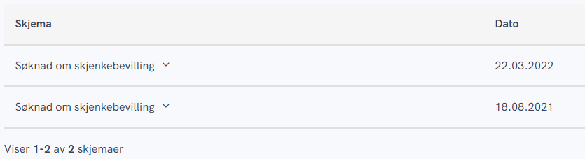 Her finner du en oversikt over tidligere påbegynte og innsendte søknader om skjenkebevilling. Skal du søke om en lignende bevilling på nytt kan du bare kopiere den du har sendt tidligere.